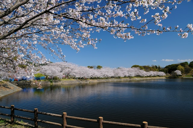벚꽃나무가 우거진 산책로가 호수를 따라 이어져 있으며, 목재로 만들어진 난간이 자연 친화적인 분위기를 더해줍니다. 호숫가에 늘어선 벚꽃나무들은 서로 어우러져 부드러운 곡선을 이루고 있으며, 그 배경으로는 푸른 언덕과 맑은 하늘이 펼쳐져 있습니다. 벚꽃이 가득 핀 가지들이 마치 하늘을 수놓은 듯하며, 자연과 어우러진 이 풍경은 보는 이들에게 힐링을 선사합니다.